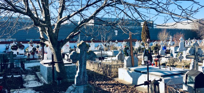 Old cemetery tree serene among crosses and tombs.