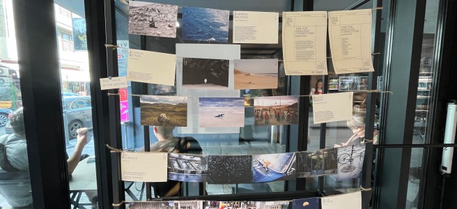 Windows into other eyes hanging on a line springtime postcards.