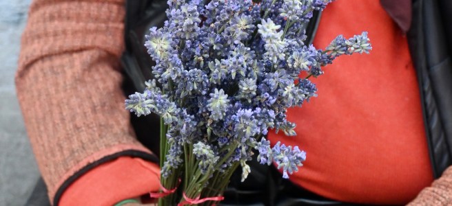 Breath of lavender— old woman with a crutch selling summer flowers.