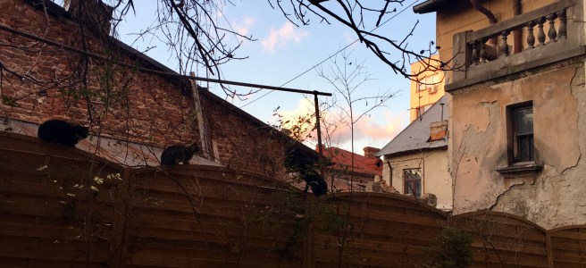 Black cats on the fence balancing on the edge of sunset.